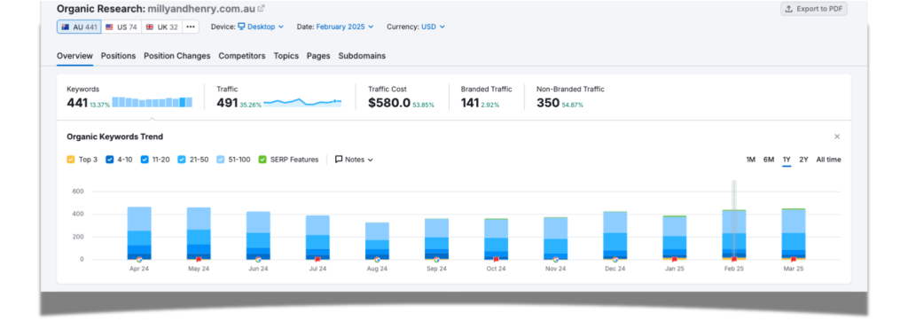 As a result of our digital strategy, For Keeps Merch achieved a 214% increase in organic traffic over a 12-month period. Keyword rankings grew steadily, with 1.6K keywords now driving consistent traffic to the site, and non-branded search traffic surged by over 240%, broadening their reach beyond existing customers. The overall value of their organic traffic rose by 147%, indicating stronger visibility for high-converting search terms. With a significantly expanded audience and optimised ecommerce performance, For Keeps Merch is now positioned for sustained online growth and stronger brand recognition across Australia.