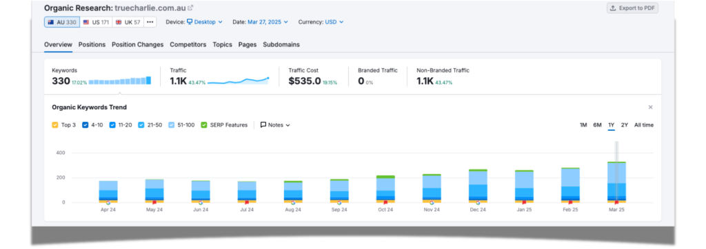 Within 12 months, True Charlie experienced a 43% uplift in organic website traffic and a 17% growth in keyword rankings across critical product and content categories. Non-branded traffic made up 100% of their organic sessions, highlighting the success of targeting new audiences outside of existing brand awareness. The overall organic traffic value rose by 19%, reflecting stronger performance across mid and high-intent search terms. With consistent growth month-on-month, True Charlie is now better positioned in competitive search landscapes and primed for ongoing expansion both within Australia and internationally.